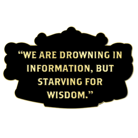 Back says "WE ARE DROWNING IN INFORMATION, BUT STARVING FOR WISDOM".